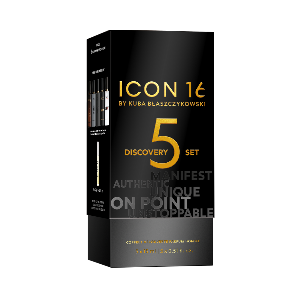 Discovery Set ICON16 av Kuba Błaszczykowski är ett set med fem Eau de Parfum för män i miniformat, skapat i Grasse, Frankrike, världens parfymhuvudstad. Det är det perfekta sättet att utforska hela ICON16-kollektionen och välja en doft som passar din stil.